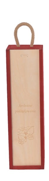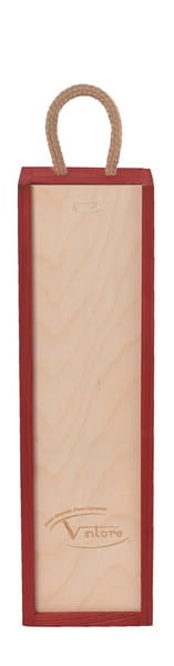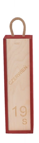 Skrzynka drewniana Vintore-1 na wino w kolorze czerwonym w nietuzinkowym połączeniu z jasną, naturalną zasuwką. Idealna skrzynka upominkowa na jedną butelkę wina.