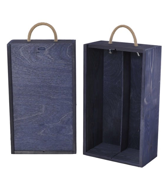 Skrzynka drewniana Vintore -2 na wino w kolorze granatowym. Idealna skrzynka upominkowa na dwie butelki wina, ekologiczne i eleganckie opakowanie wykonane z drewna sosnowego.