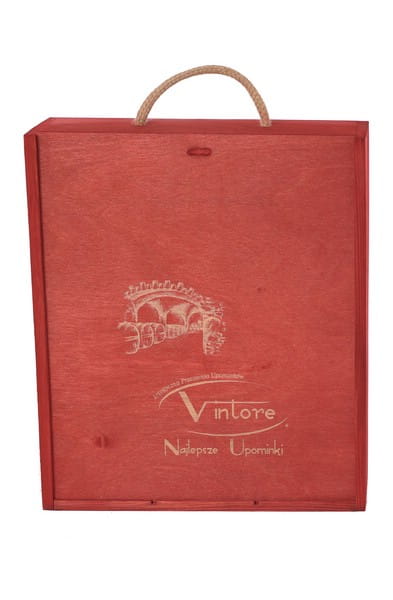 Skrzynka drewniana Vintore -3 na wino w kolorze czerwonym. Idealna skrzynka upominkowa na trzy butelki wina, ekologiczne i eleganckie opakowanie wykonane z drewna sosnowego.