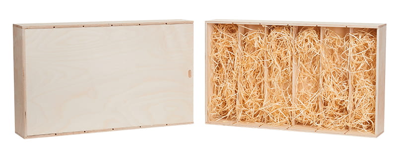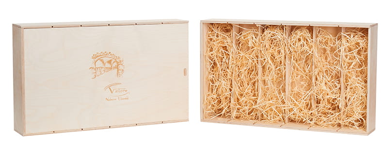 Skrzynka drewniana Vintore -6 na wino w kolorze naturalnym. Idealna skrzynka upominkowa na sześć butelek wina, ekologiczne i eleganckie opakowanie wykonane ze sklejki brzozowej.