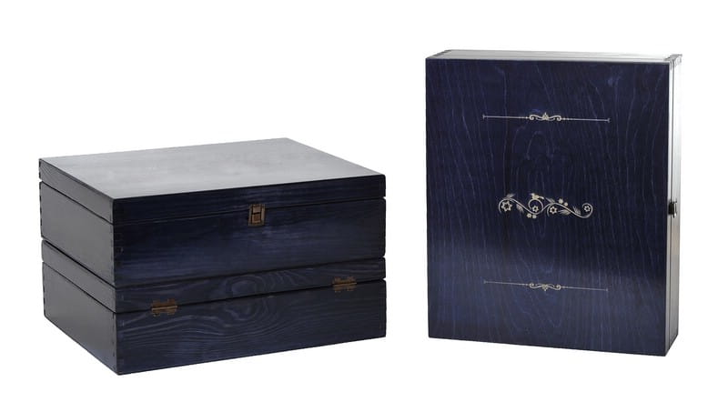 Skrzynka drewniana Vintore Kuferek -3 na wino w kolorze granatowym, lakierowana. Idealna skrzynka upominkowa na trzy butelki wina, ekologiczne i eleganckie opakowanie wykonane z drewna sosnowego.
