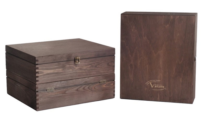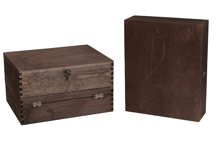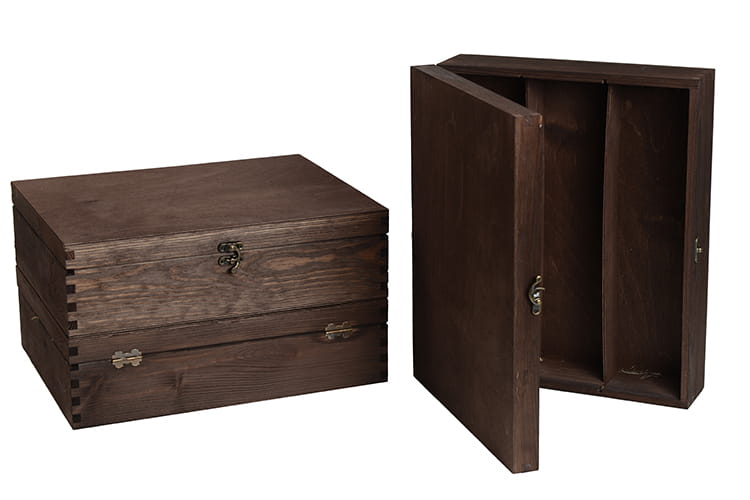 Skrzynka drewniana Vintore Kuferek -3 na wino w kolorze palisander. Idealna skrzynka upominkowa na trzy butelki wina, ekologiczne i eleganckie opakowanie wykonane z drewna sosnowego.