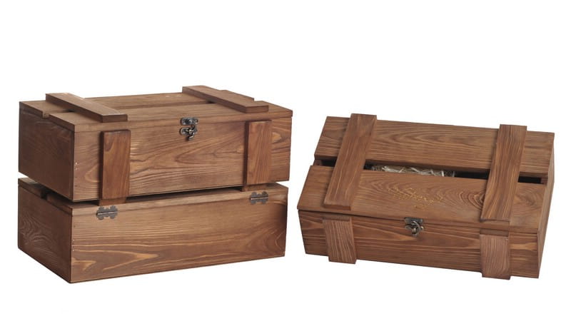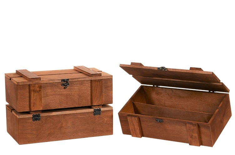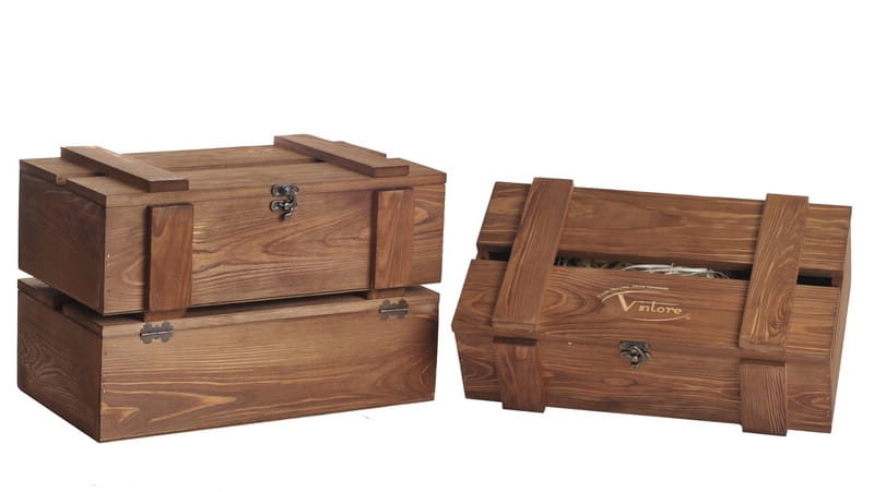 Skrzynka drewniana Vintore Kuferek Szczebelkowy -2 na wino w kolorze brązowym. Oryginalna skrzynka upominkowa na dwie butelki wina, ekologiczne i eleganckie opakowanie wykonane ze sklejki brzozowej i drewna sosnowego.