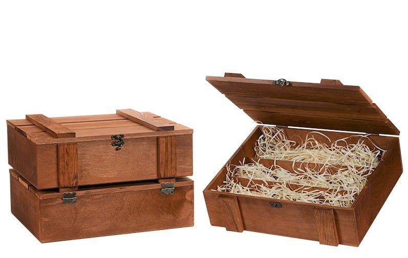Skrzynka drewniana Vintore Kuferek Szczebelkowy -3 na wino w kolorze brązowym. Oryginalna skrzynka upominkowa na trzy butelki wina, ekologiczne i eleganckie opakowanie wykonane ze sklejki i z drewna sosnowego.