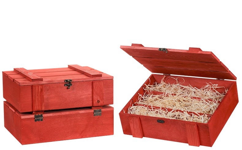 Skrzynka drewniana Vintore Kuferek Szczebelkowy -3 na wino w kolorze czerwonym. Oryginalna skrzynka upominkowa na trzy butelki wina, ekologiczne i eleganckie opakowanie wykonane ze sklejki brzozowej i z drewna sosnowego.