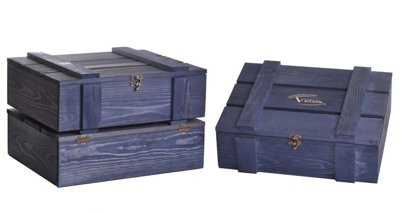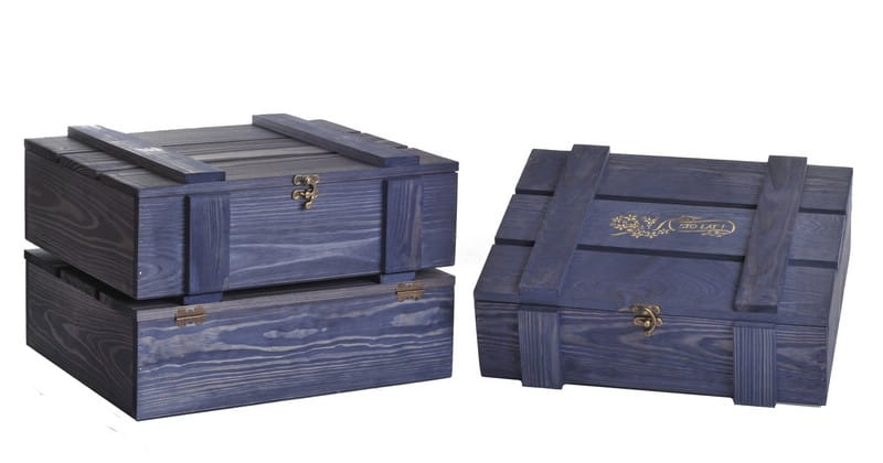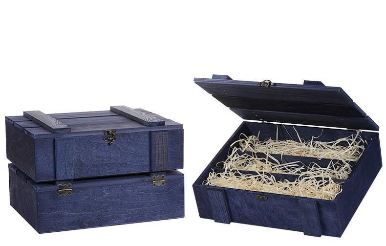 Skrzynka drewniana Vintore Kuferek Szczebelkowy -3 na wino w kolorze granatowym. Oryginalna skrzynka upominkowa na trzy butelki wina, ekologiczne i eleganckie opakowanie wykonane ze sklejki i z drewna sosnowego.