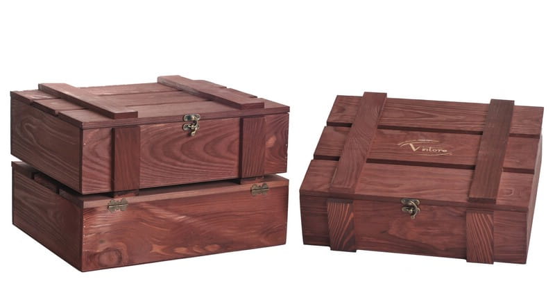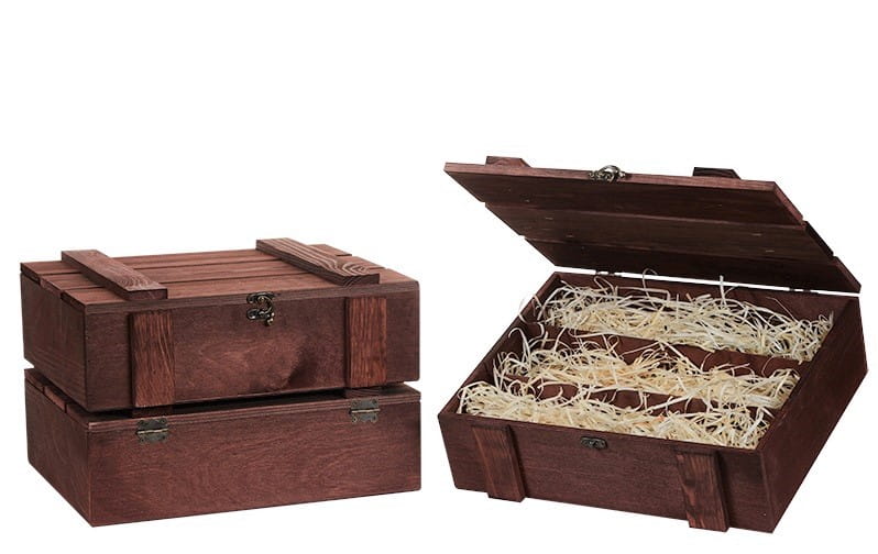 Skrzynka drewniana Vintore Kuferek Szczebelkowy -3 na wino w kolorze mahoniowym. Oryginalna skrzynka upominkowa na trzy butelki wina, ekologiczne i eleganckie opakowanie wykonane ze sklejki i z drewna sosnowego.