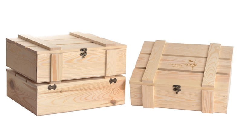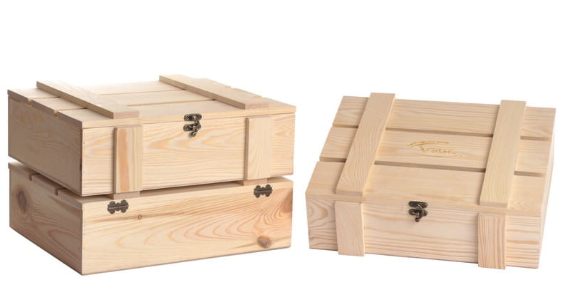 Skrzynka drewniana Vintore Kuferek Szczebelkowy -3 na wino w kolorze naturalnym. Oryginalna skrzynka upominkowa na trzy butelki wina, ekologiczne i eleganckie opakowanie wykonane ze sklejki brzozowej i z drewna sosnowego.